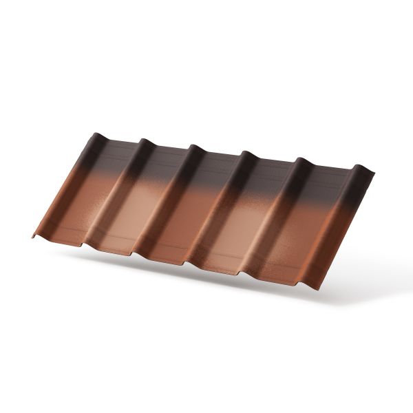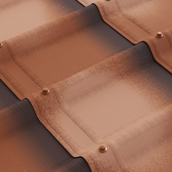 Черепица Ондувилла Фиорентино окрашена в 4 слоя: грунтовочная окраска плюс три декоративных слоя, которые защищают кровлю от выгорания.